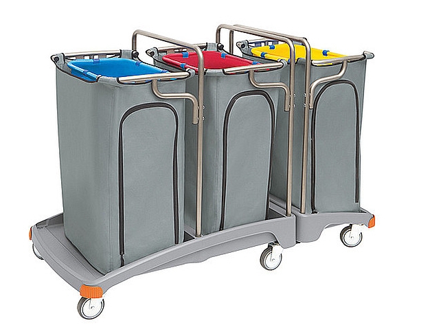 Potrójny wózek na odpady z tworzywa sztucznego. Wyposażenie standardowe: 1. podstawa XL TS PODS-0020, 2. podstawa L TS PODS-0019, 3. 2 x odbojnik nr 1 zestawu TS ODB-0001, 4. 2 x odbojnik nr 2 zestawu TS ODB-0002, 5. blacha - łącznik podstaw nr 1 BLAC-0004, 6. blacha - łącznik podstaw nr 2 BLAC-0005, 7. 3 x rurka – ramka główna RURK-0034, 8. 3 x rurka worka z podpórkami RURK-0042, 9. 6 x kółko 100 mm z płytką mocującą KOLK-0006, 10. 15 x zapinka worka ZAPI-0001, 11. worek 120 l niebieski WORE-0002, 12. worek 120 l czerwony WORE-0001, 13. worek 120 l żółty WORE-0003, 14. 3 x worek osłonowy boczny 120 l szary WORE-0033. 1szt./1 paczka (1040x670x500 mm). Waga: netto - 25,2 kg, brutto - 26,8 kg. 4 szt./1 paleta (800x1200 mm).