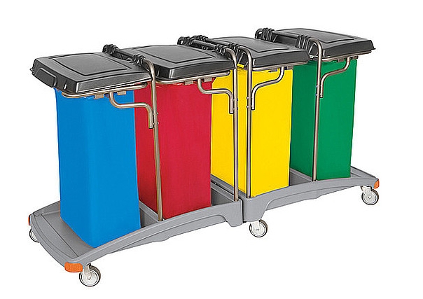 KOLK-0006, 9. 20 x zapinka worka ZAPI-0001, 10. worek 120 l niebieski WORE-0002, 11. worek 120 l czerwony WORE-0001, 12. worek 120 l żółty WORE-0003, 13. worek 120 l zielony WORE-0004, 14. 4 x pokrywa 120 l TS czarna POKR-0084. 1szt./1 paczka (1040x670x500 mm). Waga: netto - 40 kg, brutto - 43,2 kg. 2 szt./1 paleta (800x1200 mm).