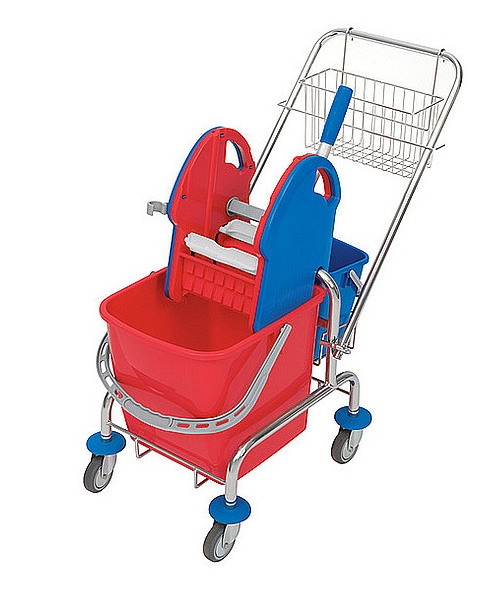 Wyposażenie standardowe:1. konstrukcja wózka chromowana KONS-0001, 2. rączka do wózka 01.20. CH RACZ-0002, 3. prasa do wyciskania czerwono/niebieska PRAS-0014, 4. wiadro 20 l czerwone WIAD-0018, 5. wiadro 6 l niebieskie WIAD-0004, 6. koszyk 40480 KOSZ-0010, 7. koszyk 40471 KOSZ-0001. 1 szt./1 paczka (700x420x490mm). Waga: netto - 9,1 kg, brutto - 10,1 kg. 12 szt./1 paleta (800x1200 mm).