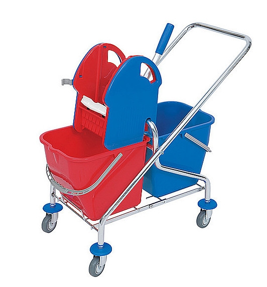 Wyposażenie standardowe: 1. konstrukcja wózka chromowana składana KONS-0004, 2. prasa do wyciskania czerwono/niebieska PRAS-0014, 3. wiadro 20 l czerwone WIAD-0018, 4. wiadro 20 l niebieskie WIAD-0020. 1 szt./1 paczka (1060x460x340mm). Waga: netto - 9,9 kg, brutto - 10,9 kg. 10 szt./1 paleta (800x1200 mm).