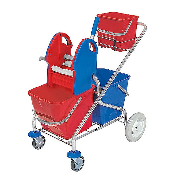 Wyposażenie standardowe: 1. konstrukcja wózka chromowana składana schodowa KONS-0006, 2. prasa do wyciskania czerwono/niebieska PRAS-0014, 3. wiadro 20 l czerwone WIAD-0018, 4. wiadro 20 l niebieskie WIAD-0020, 5. wiadro 6 l czerwone WIAD-0002, 6. koszyk 40481 KOSZ-0011. 1 szt./1 paczka (1150x550x330mm). Waga: netto - 11,3 kg, brutto - 12,4 kg. 6 szt./1 paleta (800x1200 mm).