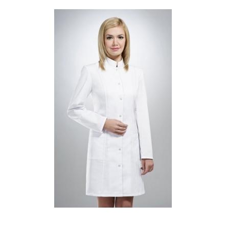 Damski fartuch medyczny ze stójką. Wyposażony w dwie kieszenie na biodrach.