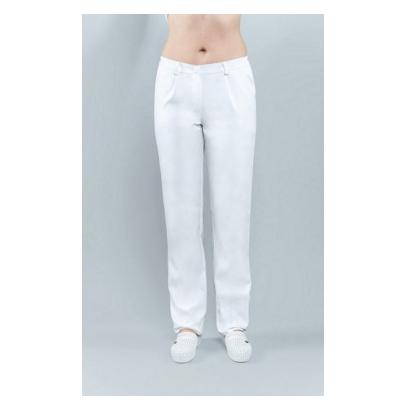 Damskie spodnie medyczne o klasycznym kroju. Zapinane na guzik oraz zamek błyskawiczny. Posiadają po bokach elastyczną gumę, która ułatwia dopasowanie spodni w talii. Wyposażone w dwie zakładki z przodu oraz dwie zaszewki z tyłu. Dwie kieszenie po bokach zmieszczą niezbędne atrubuty.