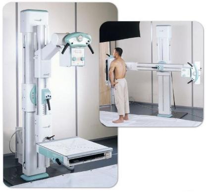 Uniwersalny system radiolograficzny z ramieniem prostym. Opis aparatu RTG: autocentryczny; Bucky z kasetą manualną i siatką 12/1; kolimator manualny; stół standardowy; generator HF 32 kW, 125 kV, 400 mA, anatomiczne programowanie, trzy fazy zasilania 380/480 V-125 kV; konsola kontrolna samostojąca; lampa RTG: 2 ogniska 1/2 mm, 21/42 kW, 125 kV, anoda - kąt 16 st., 300 kHU, 3000 obr/min.; kable wysokiego napięcia - 12 m; stół standardowy 2000 x 650 x 700 mm; waga urządzenia 294 kg. Istnieje mozliwość konfiguracji modelu zgodnie z indywidualnymi potrzebami kazdego użytkownika.