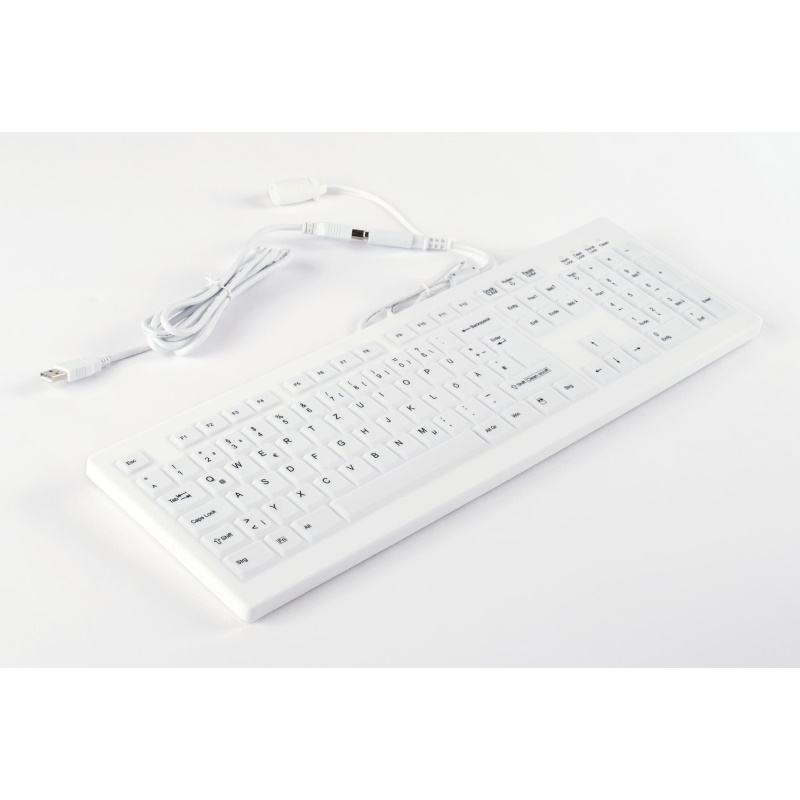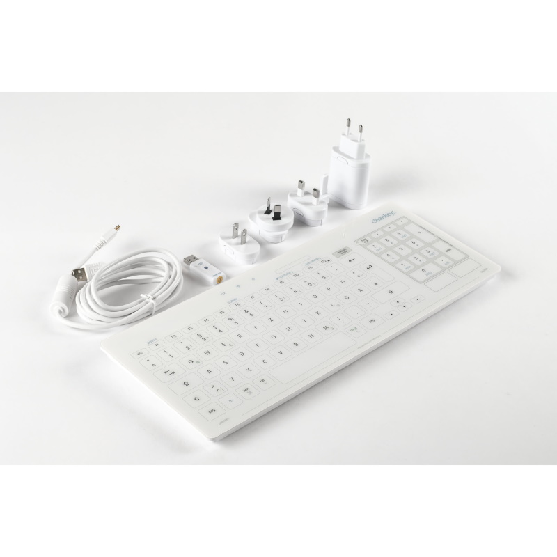 | 3FSIN863130 | Higieniczna klawiatura bezprzewodowa Klawiatura szklana Cleankeys CK3-15, Szkło Gorilla Glas 2 (0,7 mm) z panelem dotykowym (zintegrowanym w polu numerycznym, z funkcją przełączania)/USB dongle, CleanFunction do odłączenia pola przycisków podczas czyszczenia, Kolor: biały, wielkość: 387 × 150 × 22 mm, Całkowicie zamknięta (stopień ochrony IP65), Dezynfekcja przez wytarcie | 1 |