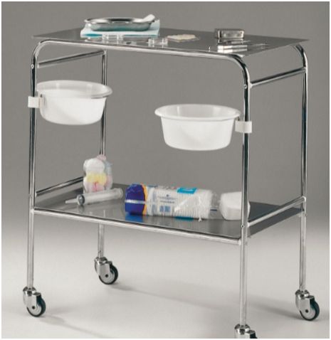 Stolik zabiegowy SM-35 posiada metalowy szkielet chromowany, dwa nierdzewne blaty, dwie uchylne miski tworzywowe, cztery kółka jezdne, w tym dwa z blokadą.