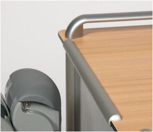 Regulacja wysokości blatu odbywa się płynnie, bezstopniowo dzięki wspomagającej sprężynie gazowej, umieszczonej w aluminiowej obudowie. Cztery podwójne koła nadające szafce dużą mobilność.