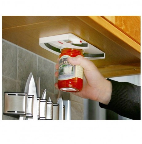 Otwieracz do słoików ma dwa tory dla różnej wielkości pokrywek i zakrętek.Może być używany do wszystkich zakrętek w przedziale od 10 mm do 90 mm. Podczas obracania słoika zakrętka jest zablokowana. Jest również wbudowany otwieracz do kapsli. Urządzenie mocuje się pod szafką kuchenną (śruby w zestawie).