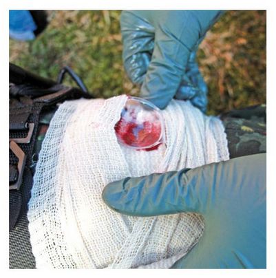 Opatrunek składa się z: kompresu nieprzywierającego do rany, wyjałowionej gazy o gęstej, nieregularnej strukturze i wysokiej chłonności. Można ją zastosować do jednoczesnego zaopatrzenia tym samym opatrunkiem zarówno rany wlotowej, jak i wylotowej. Dołączony w opakowaniu bandaż elastyczny z wypukłym plastikowym elementem pozwala docisnąć opatrunek do rany i silniej tamować krwawienie. Dla ochrony rany przed zanieczyszczeniem i uzyskania bardziej precyzyjnego, bezpośredniego ucisku, gazę można owinąć kompresem i ścisnąć bandażem elastycznym.