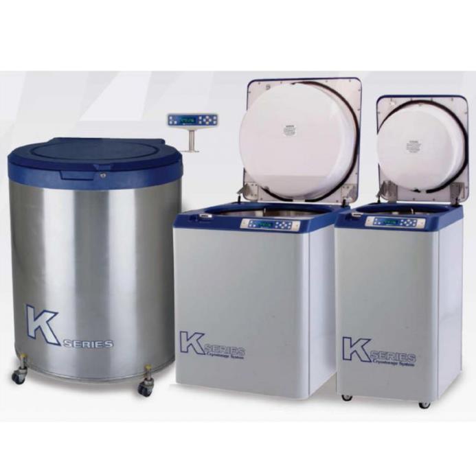 Pojemniki chłodnicze Taylor-Wharton - z automatycznym napełnianiem do przechowywania dużych ilości próbek. Seria K oferuje możliwość przechowywania od 8 000 do 38 000 próbek w probówkach lub w workach w ciekłym azocie.