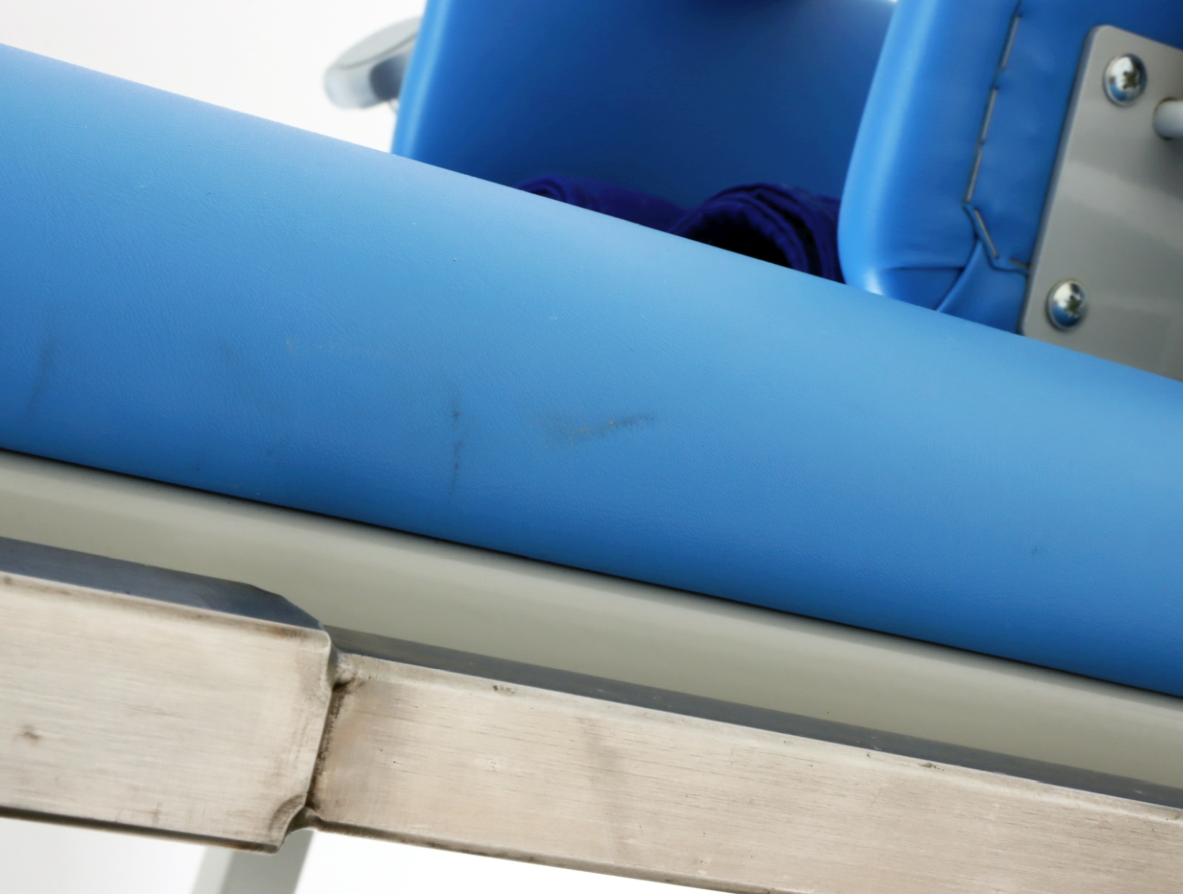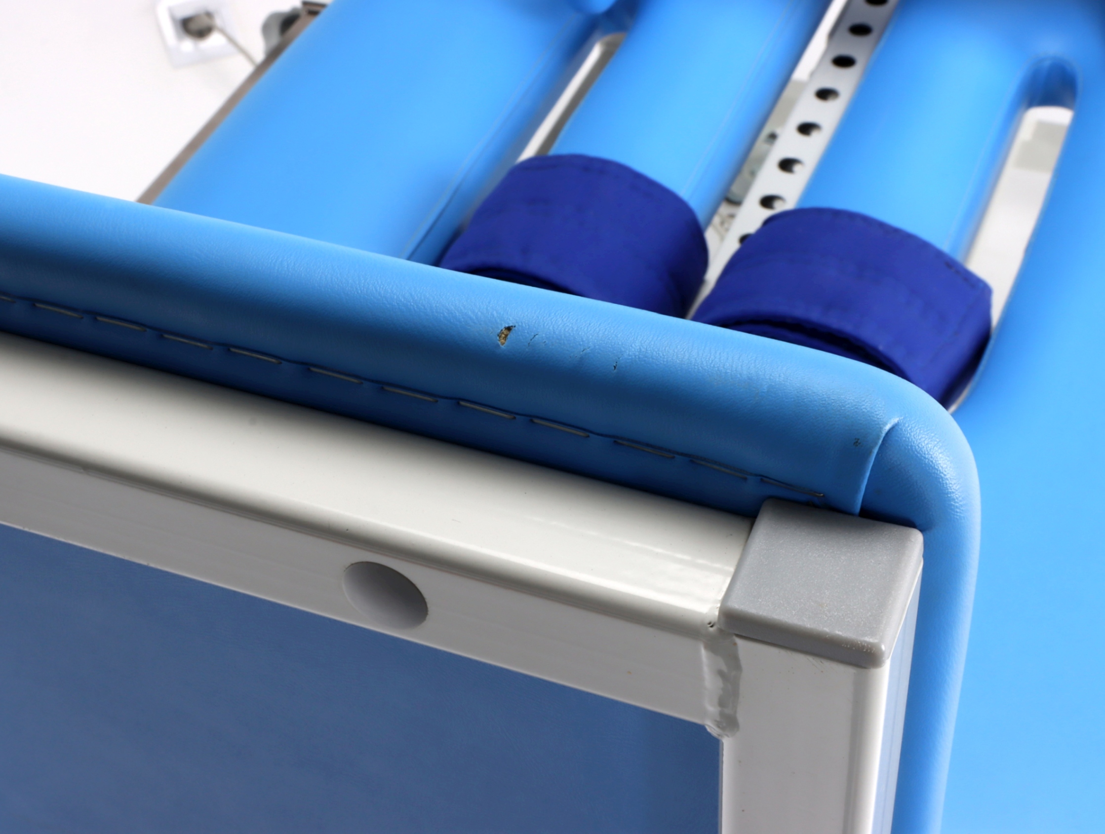 - Tapicerka z atestem medycznym w kolorze niebieskim (możliwość wymiany tapicerki na nową, z naszego wzornika kolorów za dodatkową opłatą),