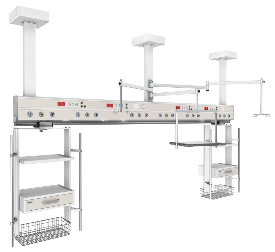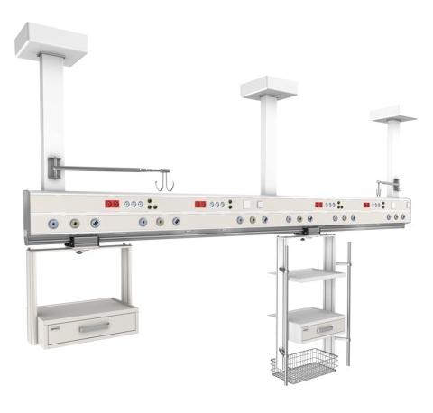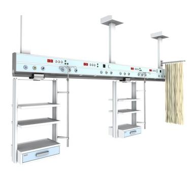 szyna instrumentalna, system szynowy ISA, wieszaki pomp infuzyjnych, wieszak teleskopowy kroplówki, półki pod aparaturę medyczną, szuflady, zestawy półkowe DEDAL