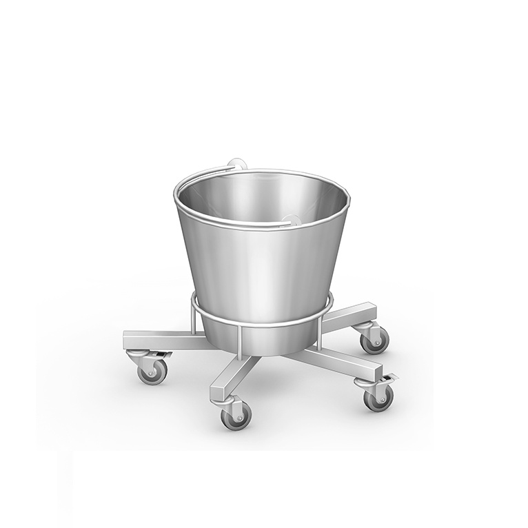 Wiadro na podstawie jezdnej SMO-04 ze stali nierdzewnej, podstawa stal kwasoodporna gat. 0H18N9. Podstawa pięcioramienna wyposażona w koła o średnicy 50 mm.