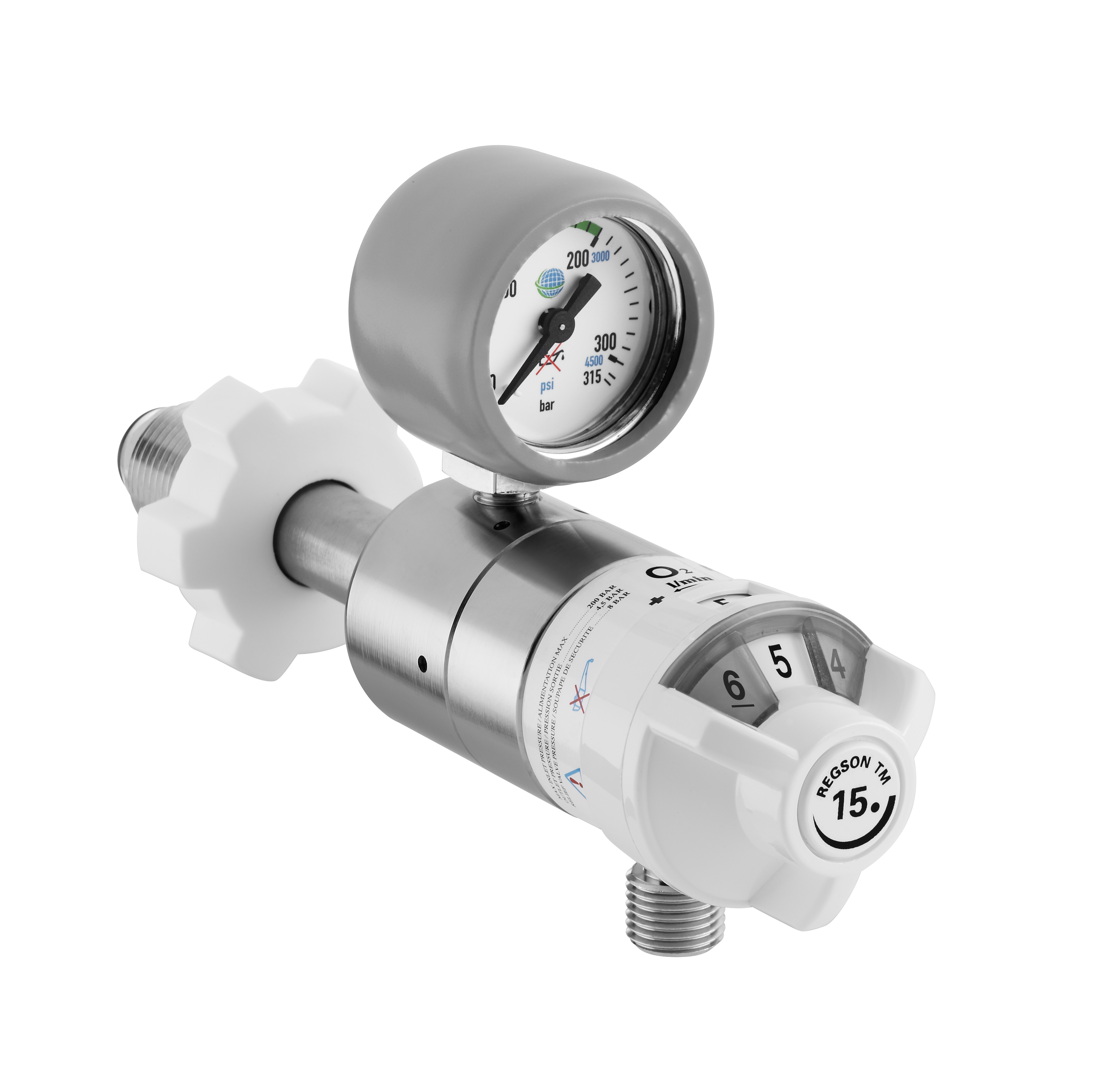 Reduktor ciśnienia na butlę z wyjściem o regulowanym skokowo przepływie z możliwością podłączenia nawilżacza.