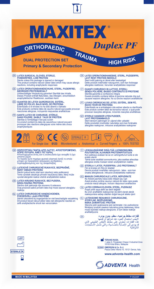 Rękawice chirurgiczne, lateksowe, teksturowane, jałowe, bezpudrowe, polimeryzowane. Komplet zawiera 2 pary w różnych kolorach zakładane jedna na drugą. Rękawice przeznaczone są do zabiegów o podwyższonym ryzyku i ortopedii. Rozmiary: 6; 6,5; 7; 7,5; 8; 8,5; 9. Pakowane: 1 kpl. w saszetce, 25 kompletów w pudełku.