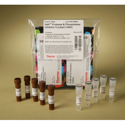| Halt™ Protease and Phosphatase Inhibitor Cocktail (100X), 5×1 ml, sufficient for 500 ml of sample, with 5×1 ml 0,5 M EDTA (100X) supplied separately | 5 ml | 78444. |
