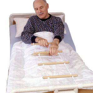 Drabinka łóżkowa ułatwiajaca osobom starszym oraz o obniżonej sprawności fizycznej podnoszenie się z pozycji leżącej do siedzącej, pacjent moze podciągać sie na kolejnych szczeblach drabinki, na zmiane chwytając obiema rękami kolejne drążki wykorzystując w ten sposób posiadane możliwości fizyczne do samodzielnego podniesienia się do pozycji siedzącej. W razie potrzeby osoba pielęgnująca może wspierać przy tym głowę i klatkę piersiową chorego, jego kooperacja zmniejsza jednak fizyczne obciążenie personelu, w szczególności odciąża plecy pielęgniarza. Motywacja pacjenta do pracy nad rozwojem własnych zasobów sił zwiększa się, a muskulatura jego rąk i ramion zostaje wzmocniona. Wyrób medyczny, Certyfikat CE. Drabinka posiada drewniane szczebelki, dzięki czemu będzie bardzo długo służyć. Długość drabinki 180 cm.