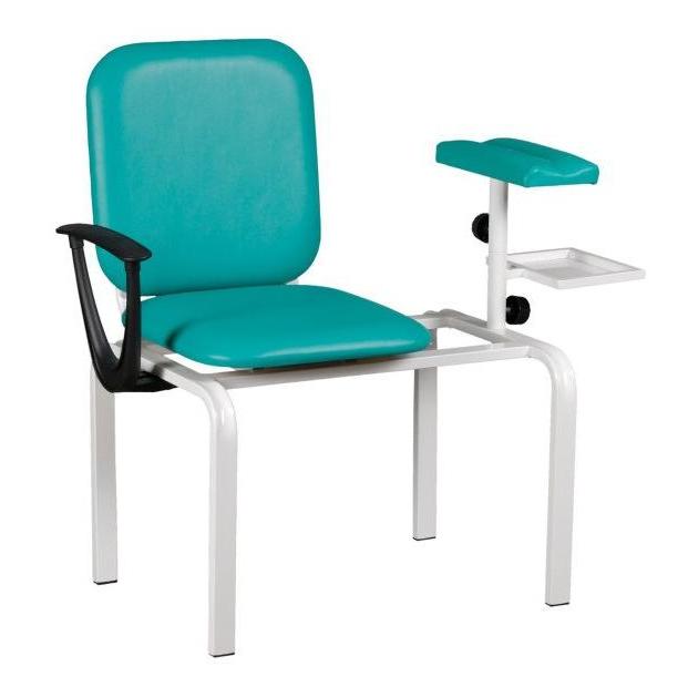 Stanowisko do pobierania krwi to najwygodniejszy sposób na sprawne przeprowadzenie zabiegu iniekcji na każdym przedramieniu, umożliwia to ruchome siedzisko. Istnieje możliwość regulacji wysokości podłokietnika odpowiednio do wzrostu pacjenta. Stanowisko poza podłokietnikiem posiada również półkę. Stabilna konstrukcja wykonana jest z kształtowników stalowych, pokrytych farbą proszkową; oparcie, siedziskoi podłokietnik wykonane są z płyty obitej pianką poliuretanową i obszyte materiałem skóropodobnym, łatwym w utrzymaniu czystości.