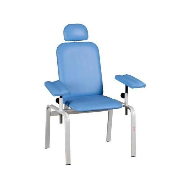 Fotel do pobierania krwi TOM-PAG GT/02jest idealny nie tylko jako wyposażenie gabinetów lekarskich, lecz również sprawdzi się w szpitalach,laboratoriach oraz prywatnych placówkach zdrowia.Fotel posiada dwa regulowane podłokietniki oraz zagłówek, służący do podparcia głowy pacjenta. Stabilna konstrukcja wykonana jest z kształtowników stalowych, pokrytych farbą proszkową; oparcie, siedzisko i podłokietnik wykonane są z płyty obitej pianką poliuretanową i obszyte skajem