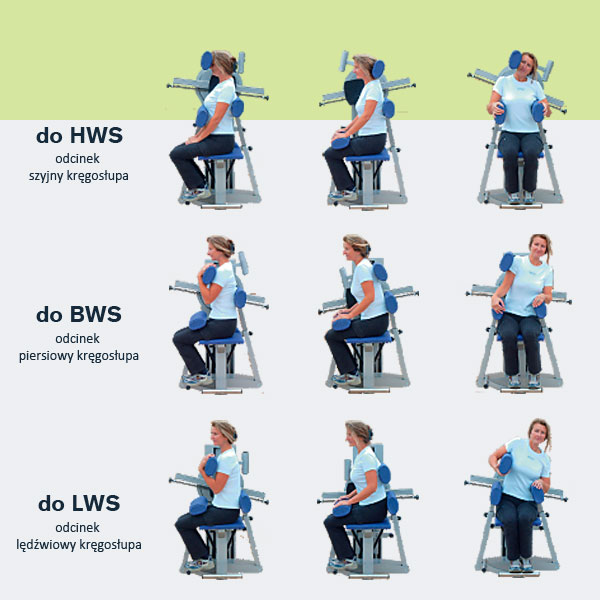 Jedyny w swoim rodzaju wielofunkcyjny system terapeutyczny dla pozycji treningowych: zgięcie, wyprost i ugięcie boczne, stosowanych podczas terapii kręgosłupa.