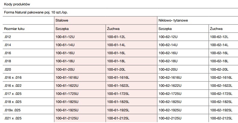 Dostępne w wersji stalowej oraz niklowotytanowe, w formie szerszej w przekroju okrągłym od 0.12 do .020 oraz krawężnym od 0.16x0.22 do 0.21x0.25