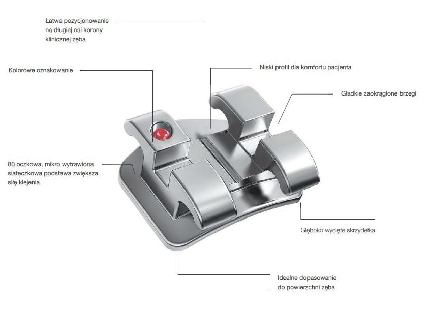 Zamki mini to zwiększenie komfortu, łatwiejsze utrzymanie higieny jamy ustnej oraz przyjemniejszy estetycznie wybór dla Państwa pacjenta. Zamek odlany ze stopu stali nierdzewnej 17-4 tworzy integralną całość z haczykami, co zapewnia łatwe i bezpieczne zaczepianie elastików. Ukośnie wyprofilowane okluzyjne skrzydełka dolnych siekaczy redukują możliwość interferencji siecznych. 80 oczkowa, mikro wytrawiona siateczka na podstawie zamka zapewnia najlepszą z dostępnych na rynku retencji. Odpowiednie ukształtowanie i wyprofilowanie bazy umożliwia precyzyjne dopasowanie do powierzchni korony zęba. Właściwie ukształtowanie mezjalnodystalne oraz zgryzowo- dziąsłowe podstawy zapewnia prawidłowe i sprawne umiejscowienie zamka. Kolorowe oznakowania na każdym z zamków ułatwiają identyfikację.