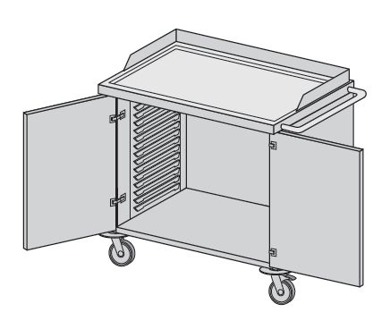 Meble modułowe wg normy DIN. Wózek systemowy ogólnozabiegowy z zamontowaną systemową prowadnicą ścienną z tworzywa ABS.