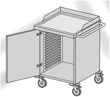 Meble modułowe wg normy DIN. Wózek systemowy ogólnozabiegowy z zamontowaną systemową prowadnicą ścienną z tworzywa ABS.
