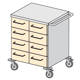 Wózki i stoliki medyczne przeznaczone do transportowania i przechowywania środków medyczno-opatrunkowych oraz innych materiałów pomocniczych. Wyposażone standardowo w wysokiej jakości zespoły jezdne o średnicy Ř100 i Ř125 mm oraz odboje zabezpieczające wyrób i otoczenie przed uszkodzeniem. Na życzenie Zamawiającego wózki i stoliki mogą być wyposażone w specjalistyczny sprzęt pomocniczy opisany na stronach 169-175 katalogu. Standardowo blaty płaskie lub na życzenie Zamawiającego zagłębione, wyposażone w dodatkowe relingi zabezpieczające przewożone materiały przed wypadnięciem lub zsunięciem. W opcji zamek centralny.