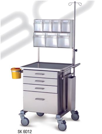 Model podstawowy K 6003 doposażony dodatkowo w: – dwie szyny sprzętowe na akcesoria nr kat. W 202, – zestaw dozowników 5 i 4 skrzynkowych na materiały opatrunkowe zabiegowe nr kat. W 263, – wieszak na płyny infuzyjne nr kat. W 212, – uchwyt z miską na odpady nr kat. W 226, – pojemnik na cewniki nr kat. W 221, – stelaż z pokrywą do worka na odpady miękkie nr kat. W 224, – uchwyt z pojemnikiem na zużyte igły nr kat. W 225
