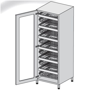 Meble modułowe wg normy DIN. Szafa systemowa jednodrzwiowa oszklona przystosowana do zamontowania wysuwanych metalowych ram służących do osadzenia koszy i kuwet. Proponowane przykładowe wyposażenie może być modyfikowane zgodnie z tabelą wyposażenia na str. 63 katalogu, z zachowaniem podanych ilości przy opisanych gabarytach organizerów. W opcji zamki patentowe jednoi wielopunktowe typu baskwil. Wyposażenie szafy: – kosz typ A-02 lub kuweta typ AA-12 – 6 szt. L=538, B=500, H=180 mm.