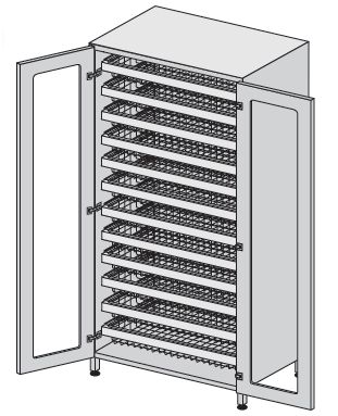Meble modułowe wg normy DIN. Szafa systemowa dwudrzwiowa oszklona przystosowana do zamontowania wysuwanych metalowych ram służących do osadzenia koszy i kuwet. Proponowane przykładowe wyposażenie może być modyfikowane zgodnie z tabelą wyposażenia na str. 63 katalogu, z zachowaniem podanych ilości przy opisanych gabarytach organizerów. W opcji zamki patentowe jednoi wielopunktowe typu baskwil. Wyposażenie: – kosz typ A-03 – 12 szt. L=835, B=500, H=100 mm.