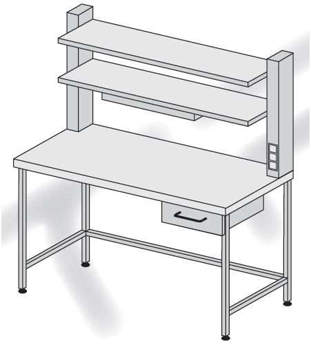 Stanowisko do pakietowania pojedyncze. Proponowane wyposażenie: – blat roboczy „ciepły” typu TRESPA; – nadstawka z dwoma półkami; – szuflada – 1 szt.; – oświetlenie blatu zamontowane; pod dolną półką; – dwa gniazda elektryczne (max. 6 A/240 V) – 1 kpl.