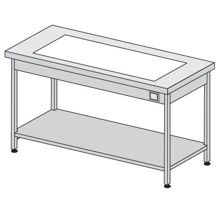 Stół z podświetlanym blatem. Wyposażenie standardowe: – w blacie szyba bezpieczna biała; – płyta rozpraszająca światło; – dwa gniazda elektryczne (max. 6 A/240 V) – 1 kpl.; – oświetlenie z przewodem przyłączeniowym o dł. 3 mb.