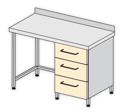 Stół roboczy z szafką. Wykonane w różnych konfiguracjach wymiarowych i rodzajowych. Standardowo wyposażone w regulatory wysokości, szuflady na prowadnicach rolkowych. Blaty robocze wykonane jako płaskie lub zagłębione z fartuchem tylnym. Standardowo wykonane jak pokazano na poniższych schematach ze stali kwasoodpornej gat. OH18N9. Na życzenie Zamawiającego blaty mogą być z innych materiałów zgodnie z zamieszczonym opisem (str. 129-132 katalogu). Szuflady typu skrzyniowego wykonane z tego samego materiału co korpus.