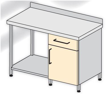 Stół roboczy z szafką. Wykonane w różnych konfiguracjach wymiarowych i rodzajowych. Standardowo wyposażone w regulatory wysokości, szuflady na prowadnicach rolkowych. Blaty robocze wykonane jako płaskie lub zagłębione z fartuchem tylnym. Standardowo wykonane jak pokazano na poniższych schematach ze stali kwasoodpornej gat. OH18N9. Na życzenie Zamawiającego blaty mogą być z innych materiałów zgodnie z zamieszczonym opisem (str. 129-132 katalogu). Szuflady typu skrzyniowego wykonane z tego samego materiału co korpus.