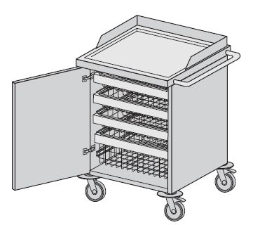 Meble modułowe wg normy DIN. Wózek systemowy ogólnozabiegowy jednodrzwiowy przystosowany do zamontowania wysuwanych metalowych ram służących do osadzenia koszy i kuwet. Wózki standardowo wyposażone w blaty robocze wykonane z tworzywa ABS. Na życzenie Zamawiającego blaty mogą być wykonane ze stali kwasoodpornej gatunku OH18N9. Standardowo wyposażone w zamki patentowe jedno lub wielopunktowe. Wyposażenie: – kosz typ A-01 lub kuweta typ AA-11 – 3 szt. L=538, B=500, H=100 mm; – kosz typ A-02 lub kuweta typ AA-12 – 1 szt. L=538, B=500, H=180 mm.