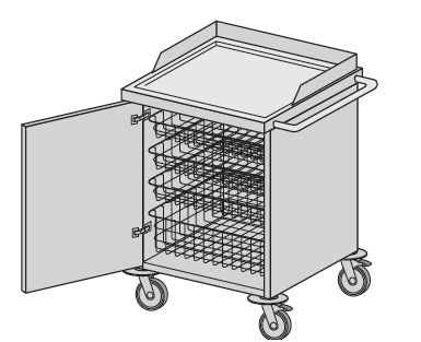 Meble modułowe wg normy DIN. Wózek systemowy jednodrzwiowy ogólnozabiegowy z zamontowaną systemową prowadnicą ścienną z tworzywa ABS. Wyposażenie wózka: – kosz typ A-01 lub kuweta typ AA-11 – 3 szt. L=538, B=500, H=100 mm; – kosz typ A-02 lub kuweta typ AA-12 – 1 szt. L=538, B=500, H=180 mm.