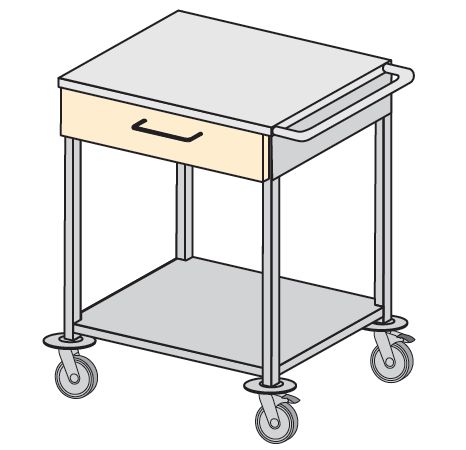 Wózki i stoliki medyczne. Przeznaczone do transportowania i przechowywania środków medyczno-opatrunkowych oraz innych materiałów pomocniczych. Wyposażone standardowo w wysokiej jakości zespoły jezdne o średnicy Ř100 i Ř125 mm oraz odboje zabezpieczające wyrób i otoczenie przed uszkodzeniem. Na życzenie Zamawiającego wózki i stoliki mogą być wyposażone w specjalistyczny sprzęt pomocniczy. Standardowo blaty płaskie lub na życzenie Zamawiającego zagłębione, wyposażone w dodatkowe relingi zabezpieczające przewożone materiały przed wypadnięciem lub zsunięciem.