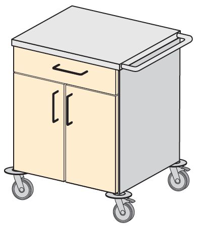 Wózki i stoliki medyczne. Przeznaczone do transportowania i przechowywania środków medyczno-opatrunkowych oraz innych materiałów pomocniczych. Wyposażone standardowo w wysokiej jakości zespoły jezdne o średnicy Ř100 i Ř125 mm oraz odboje zabezpieczające wyrób i otoczenie przed uszkodzeniem. Na życzenie Zamawiającego wózki i stoliki mogą być wyposażone w specjalistyczny sprzęt pomocniczy. Standardowo blaty płaskie lub na życzenie Zamawiającego zagłębione, wyposażone w dodatkowe relingi zabezpieczające przewożone materiały przed wypadnięciem lub zsunięciem. Wyposażenie: – jedna przestawna regulowana półka, – w opcji zamek centralny i patentowy jednopunktowy.