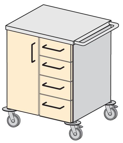 Wózki i stoliki medyczne. Przeznaczone do transportowania i przechowywania środków medyczno-opatrunkowych oraz innych materiałów pomocniczych. Wyposażone standardowo w wysokiej jakości zespoły jezdne o średnicy Ř100 i Ř125 mm oraz odboje zabezpieczające wyrób i otoczenie przed uszkodzeniem. Na życzenie Zamawiającego wózki i stoliki mogą być wyposażone w specjalistyczny sprzęt pomocniczy. Standardowo blaty płaskie lub na życzenie Zamawiającego zagłębione, wyposażone w dodatkowe relingi zabezpieczające przewożone materiały przed wypadnięciem lub zsunięciem. Wyposażenie: – dwie przestawne regulowane półki, – w opcji zamek centralny i patentowy jednopunktowy.