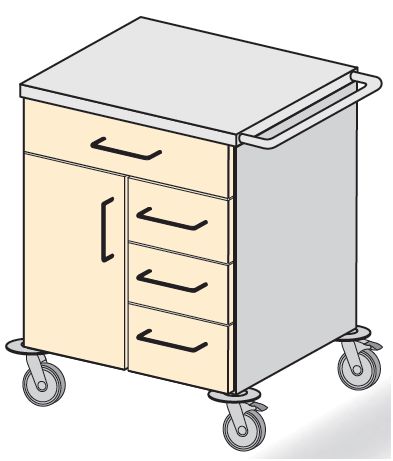 Wózki i stoliki medyczne. Przeznaczone do transportowania i przechowywania środków medyczno-opatrunkowych oraz innych materiałów pomocniczych. Wyposażone standardowo w wysokiej jakości zespoły jezdne o średnicy Ř100 i Ř125 mm oraz odboje zabezpieczające wyrób i otoczenie przed uszkodzeniem. Na życzenie Zamawiającego wózki i stoliki mogą być wyposażone w specjalistyczny sprzęt pomocniczy. Standardowo blaty płaskie lub na życzenie Zamawiającego zagłębione, wyposażone w dodatkowe relingi zabezpieczające przewożone materiały przed wypadnięciem lub zsunięciem. Wyposażenie: – jedna przestawna regulowana półka, – w opcji zamek centralny i patentowy jednopunktowy.