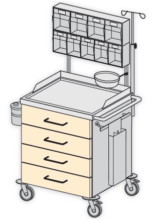 Model podstawowy SK 6003 doposażony dodatkowo w: – dwie szyny sprzętowe na akcesoria nr kat. W 202, – zestaw dozowników 5 i 4 skrzynkowych na materiały opatrunkowe zabiegowe nr kat. W 263, – wieszak na płyny infuzyjne nr kat. W 212, – uchwyt z miską na odpady nr kat. W 226, – pojemnik na cewniki nr kat. W 221, – stelaż z pokrywą do worka na odpady miękkie nr kat. W 224, – uchwyt z pojemnikiem na zużyte igły nr kat. W 225