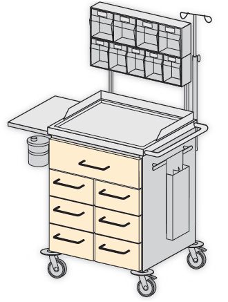 Model podstawowy SK 6008 doposażony dodatkowo w: – dwie szyny sprzętowe na akcesoria nr kat. W 202, – zestaw dozowników 5 i 4 skrzynkowych na materiały opatrunkowe zabiegowe nr kat. W 263, – wieszak na płyny infuzyjne nr kat. W 212, – uchwyt z miską na odpady nr kat. W 226, – pojemnik na cewniki nr kat. W 221, – stelaż z pokrywą do worka na odpady miękkie nr kat. W 224, – uchwyt z pojemnikiem na zużyte igły nr kat. W 225
