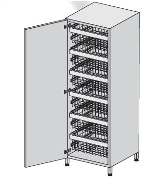 Meble modułowe wg normy DIN. Szafa systemowa jednodrzwiowa przystosowana do zamontowania wysuwanych metalowych ram służących do osadzenia koszy i kuwet. Proponowane przykładowe wyposażenie może być modyfikowane zgodnie z tabelą wyposażenia na str. 63 katalogu, z zachowaniem podanych ilości przy opisanych gabarytach organizerów. W opcji zamki patentowe jednoi wielopunktowe typu baskwil. Wyposażenie szafy: – kosz typ A-02 lubkuweta typ AA-12 – 6 szt. L=538, B=500, H=180 mm.