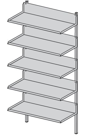 Regał ścienny pięciopółkowy o stałym rozstawie półek.