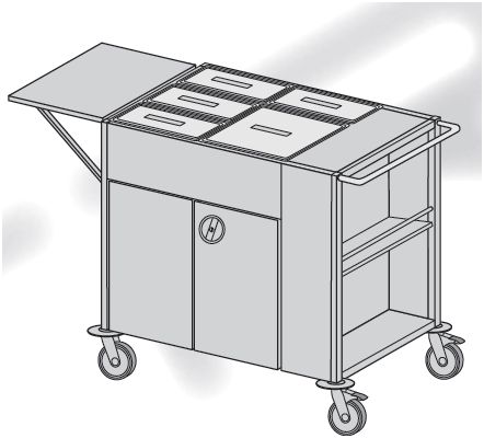 Wózek gastronomiczny oddziałowy ze stali nierdzewnej kwasoodpornej. Proponowane wyposażenie: – cztery wyjmowane pojemniki gastronomiczne z pokrywą ze stali kwasoodpornej typ G 1/3 200 o wymiarach L=176, B=325, H=200 mm; – wyjmowany pojemnik z pokrywą gastromiczny ze stali kwasoodpornej typ G 2/3 200 o wymiarach L=354, B=325, H=200 mm; – z boku półka opuszczana i podnoszona stabilna do stawiania talerzy o wymiarach 400×600 mm; – pod uchwytem /rączką/ przestrzeń otwarta z jedną półką w połowie przestrzeni do chowania naczyń brudnych; – pod blatem szafka do naczyń czystych z dwoma drzwiami, wewnątrz jedna półka regulowana.