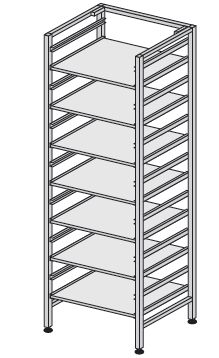 Regał systemowy wąski przystosowany do wyposażenia w kosze, kuwety i półki. Regały i wózki regałowe w systemie „TRIBO-med” wykonane są z profili kształtowych ze stali nierdzewnej kwasoodpornej lub ze stali czarnej lakierowanej farbami proszkowymi, a także w układzie mieszanym np.: ramy regałowe lakierowane farbami proszkowymi, a półki i kosze ze stali nierdzewnej. Standardowo wymiary dostosowane są do elementów wyposażenia zgodnego z modułem DIN-NORM (538×500 mm). Na życzenie Zamawiającego wyroby mogą być dostosowane do wyposażenia zgodnego z modułem ISO lub innego wynikającego z potrzeb użytkownika. Konstrukcja regałów i wózków regałowych, umożliwia dowolną konfigurację wyposażenia w kosze, kuwety i półki oraz jest kompatybilna z systemem mebli modułowych prezentowanych w tym katalogu. Wyposażenie regału: – półka typ P-11 – 7 szt. L=540, B=510 mm.