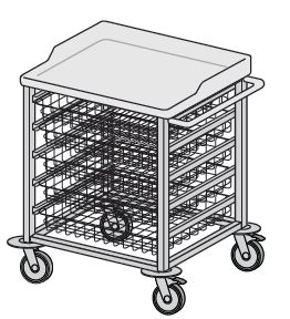 Meble modułowe wg normy DIN. Wózek regałowy – stolik opatrunkowo-zabiegowy z koszami. Wózki standardowo wyposażone w blaty robocze wykonane z tworzywa ABS. Na życzenie Zamawiającego blaty mogą być wykonane ze stali kwasoodpornej gatunku OH18N9. Wyposażenie wózka: – kosz typ A-01 lub kuweta typ AA-11 – 5 szt. L=538, B=500, H=100 mm.