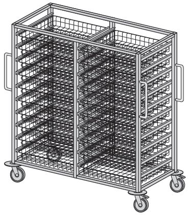 Wózek regałowy systemowy przystosowany do wyposażenia w kosze i kuwety. Wyposażenie dodatkowe – pokrowce z materiału. Wyposażenie: – kosz typ A-01 lub kuweta typ AA-11 – 20 szt. L=538 B=500, H=100 mm.